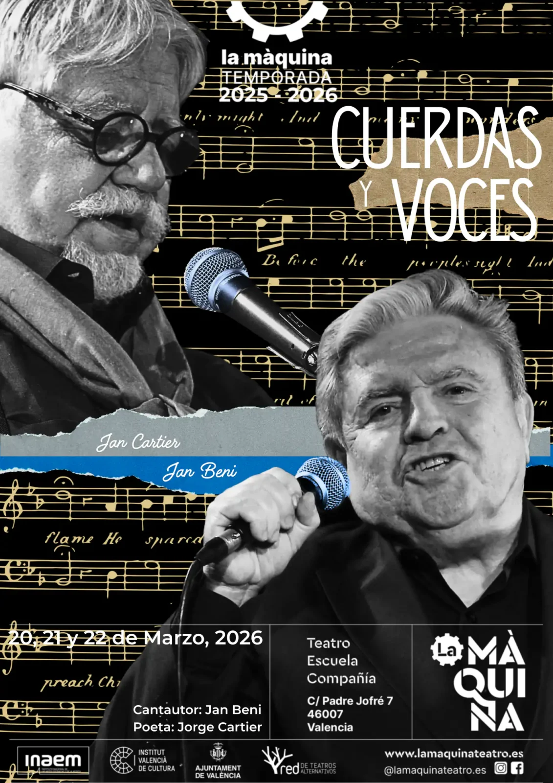 Dos artistas con amplia trayectoria en música y poesía presentan un innovador espectáculo basado en la fusión de ambas formas de expresión. Cada poema recitado por Jorge Cartier se complementa con una canción interpretada por Jan Beni, creando un diálogo artístico único y revelador.