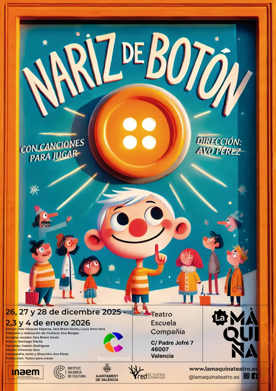 Antón odia su nariz. En el colegio le llaman «Nariz de botón», hasta que descubre algo maravilloso: en su familia nadie es «normal». Su madre tiene orejas de mariposa, su hermana mofletes de semáforo, su padre cuatro ojos y su abuelo brazos de tallarín. Lo que parecía un defecto se convierte en poder, en juego y en risa. Un espectáculo que celebra las diferencias y refuerza la autoestima infantil, porque la belleza no tiene una sola forma.